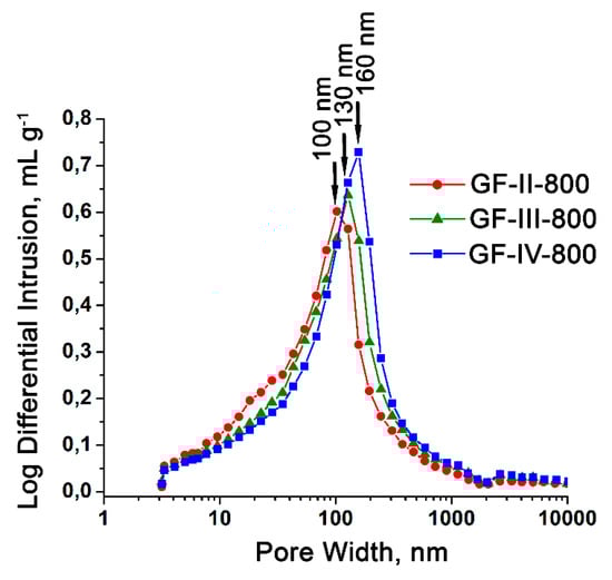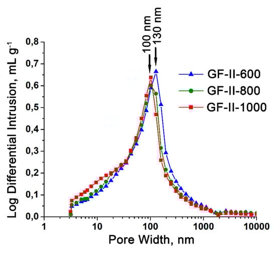 The investigation of the macroporous structure of the GF samples was carried out on a mercury porosimeter AutoPore 9605 (Micromeritics). The macropore volume (Vmacro, cm3 g−1) was calculated from the amount of mercury intruded at a pressure of 31 MPa, which corresponds to cumulative volume of pores with a characteristic width of more than 40 nm.