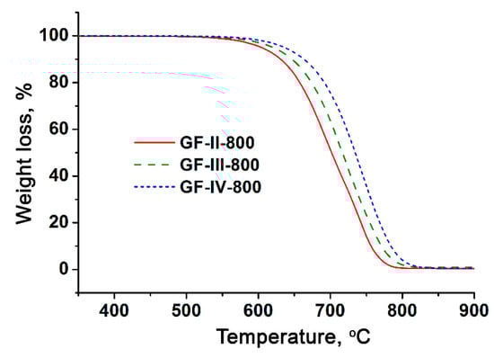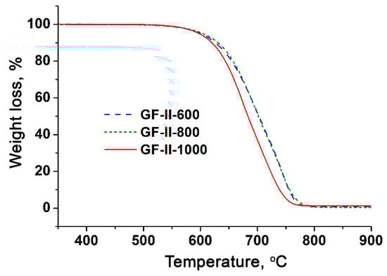 However, the dependence of the temperature of the GF oxidation beginning does not correlate with the activation energy (Table 5). The temperature at which the GF oxidation begins, on the contrary, slightly increases with an increase in the EG preparation temperature (Figure 11). This is presumably due to the presence of residual low-sized carbon fragments in the structure of GF, which are present in a significant amount in GF-II-600 and are practically absent in GF-II-1000. The higher EG preparation temperature leads to the oxidation of these carbon fragments at the stage of exfoliation and the formation of transport pores in the structure of the obtained GF [3]. On the contrary, these fragments were preserved in the composition of EG obtained at lower temperature and block the transport pores in the obtained GF. These carbon fragments in GF-II-600 begin to decompose at a lower temperature than the whole graphite matrix, and the weight loss of the sample increases at a lower temperature (Table 5).