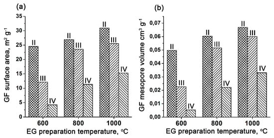 The increase in EG preparation temperature from 800 to 1000 °C leads to an increase in permeance of GF based on GIC of II, III, IV stages (Figure 7) despite the increase in EG exfoliation volume and the number of contacts between graphite packs during the pressing of EG-n-1000. According to the mercury porosimetry data, the macropore volume and characteristic width of macropores of GF-II-T practically does not change when increasing the EG preparation temperature from 800 to 1000 °C (Table 4). The nitrogen adsorption–desorption method shows that these samples have mesopores with a width of less than 50 nm. The BET surface area (sBET, m2 g−1) and the mesopore volume (Vmeso, cm3 g−1) of samples GF-n-T increases when increasing the EG preparation temperature up to 1000 °C (Figure 9a,b).