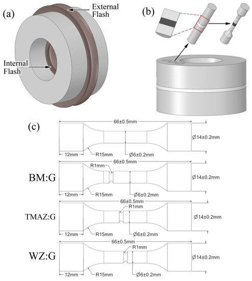 After welding, IFW joints (length of 70 mm) were taken; then, the welding flash was cut off, and there were no radial or axial cracks at the joint, as shown in Figure 2a. The IFW joints after cutting included all welding zones and the weld zone was located in the middle. As shown in Figure 2b, the round bar test samples (diameter of 14 mm and length of 70 mm) were cut from the axial direction of the welded joint. The metallographic sample was acquired from bar specimens by cutting longitudinally along the axial center, after grinding, polishing, and etching by corrosive liquid with a ratio of 1% HF + 3% HNO3 + 96% H2O, the chemical corrosion time was 5 s and the corrosion temperature was room temperature. Dumbbell-shaped specimens were obtained by further machining the round bar specimens, which were then used for tensile tests; the sizes of the dumbbell-shaped specimens are shown in Figure 2c. Circular grooves were processed in the base metal (BM), thermomechanical-affected zone (TMAZ), and weld zone (WZ). When circular grooves are processed in three different zones, stress concentration will occur, leading to the priority of the tensile fracture. In this way, the relative tensile properties of these three areas can be obtained, and the tensile fracture can be observed. The sizes of specimens with circular grooves are also indicated in Figure 2c.
