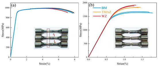 Figure 6a shows the stress–strain curves for the tensile test of the dumbbell-shaped IFW specimens. The inset of the figure shows that all specimens fractured at the BM away from the WZ; therefore, the BM was the weakest part when the joint was subjected to single axial tension. From the curve, the moduli of elasticity values of the three tests were 118.56 MPa, 119.55 MPa, and 119.32 MPa, respectively; the yield strengths were 974.84 MPa, 971.04 MPa, and 972.04 MPa, respectively; the tensile strengths were 994.70 MPa, 987.54 MPa, and 989.43 MPa, respectively; and the values of sectional shrinkage were 15.5%, 17.6%, and 17.3%, respectively. After averaging the results of the parameters obtained from the three tests, the mean modulus of elasticity was 119.14 MPa, the mean yield strength was 972.64, the mean tensile strength was 990.56 MPa, and the mean sectional shrinkage was 16.8%.
