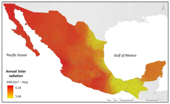 The annual average direct solar irradiance in Mexico is shown in Figure 1. In Baja California and part of the central area of the country, it is between 5.66 and 6.16 kWh/m2 day. Given the high solar radiation in Mexico, this technology would be a good option for incorporating into a CHP.