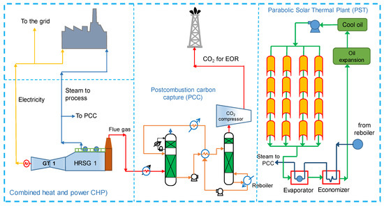 Secondly, after selecting the case with the highest efficiency, this work proposes the incorporation of a PTC to increase the power output, efficiency, and operating flexibility to supply steam and electricity. The PTC generates steam for regenerating the amine solvent of the PCC plant, as presented in Figure 2. Thus, the efficiency of the CHP plant is mostly penalised as a result of compressing the CO2.