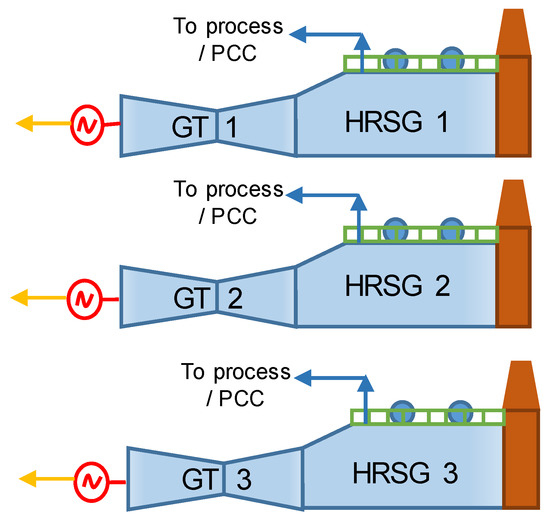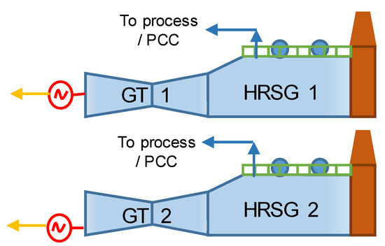 Figure 4. Case 2. Three trains of combined heat and power, with the configuration of two trains consisting of one gas turbine GT with a HRSG; and one train consisting of one gas turbine, GT 7F05, with a HRSG and one steam turbine. - Two trains of CHP, with each train consisting of a GE H01 gas turbine with a HRSG, as shown in Figure 5. The GTs have higher capacity than cases 1 and 2. The flue gas leaving the GT enters the HRSG, where intermediate pressure steam is produced for the petrochemical process and for the PCC. In addition, steam at low pressure is produced in the HRSG to increase the CHP plant´s power generation.