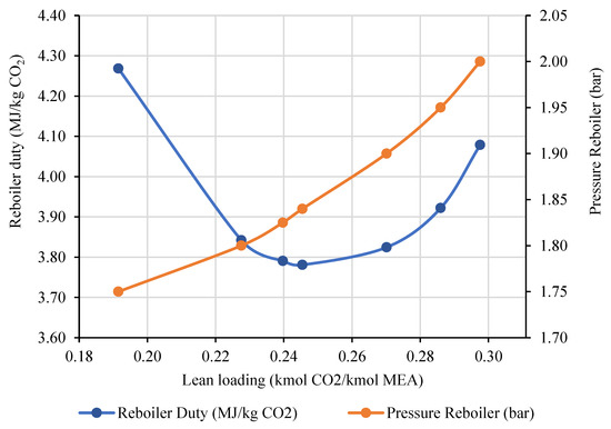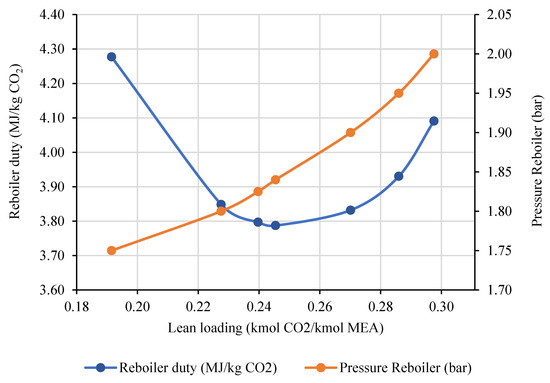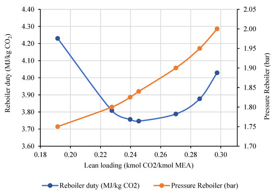 - While studying the impact of different lean loading on the capture system, the pressure in the reboiler is varied in order to adjust the lean loading. The temperature is maintained constant at 120 °C.
