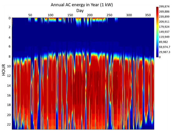 The annual thermal energy production in kW as a function of time is presented in Figure 9. As can be noted, the highest thermal energy generation is generated between 9 am and 6 pm, considering the incorporation of 6 h of energy storage.