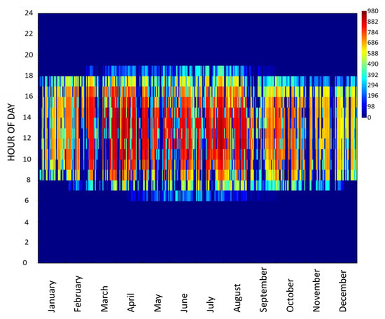 Heat map of annual direct irradiance in W/m2 during 24 h of a day.