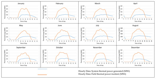 The monthly thermal power incident of the PTC is presented in Figure 12. As can be seen, the maximum thermal power incident was in August, with 212,614 MWh, and the minimum was in November, with 156,505 MWh. In the same figure, system thermal heat is presented, with the maximum in August, with 119,140 MWh, and the minimum in December, with 62,872 MWh. When the thermal heat circulates from the cold tank to the hot tank, the minimum temperature of the cold header inlet reached a value of 149.0 °C. Similarly, the maximum temperature obtained at the hot header outlet was 249.87 °C.