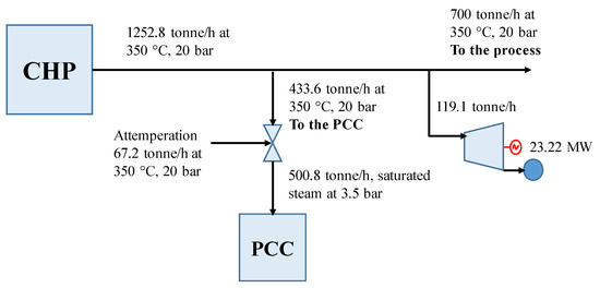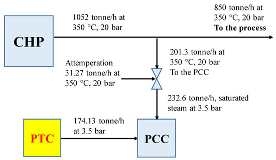 Without the PTC, as shown in Figure 16, the total steam generated from the CHP plant was 1252.8 tonne/h of steam at 350 °C and 20 bar, of which 700 tonne/h was for the process, 119.1 tonne/h for the steam turbine to generate 23.22 MW, and 433.6 tonne/h was sent to the capture plant, first passing through a valve to reduce its pressure to 3.5 bar. The 433.6 tonne/h was attemperated with 67.2 tonne/h of water in order to decrease the temperature.