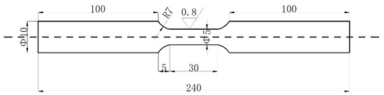Testing was carried out according to GB/T 228.2-2015 “Metallic materials tensile test part 2 high-temperature test method” [20], and the size of the sample is shown in Figure 2. The test temperatures of the pipe were 540 °C and 580 °C, according to the actual operating conditions and creep test requirements of the pipe. The sample under the high-temperature condition was only selected in the longitudinal direction, and the test was conducted on an MTS809 tension torsion testing machine. Table 5 shows the tensile performance test results at 540 °C, while the tensile performance test results at 580 °C are shown in Table 6.