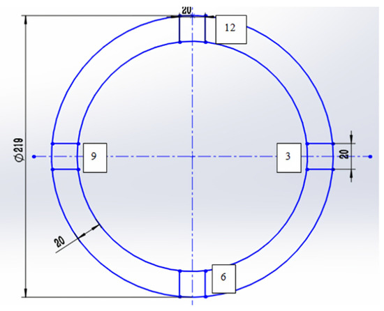 The sample was 20 mm (length) × original wall thickness (width) × 15 mm (height) in size. The position of the utilized sample is shown in Figure 3, which consisted of four directions perpendicular to each other in the cross-section of the steel pipe (0°, 90, 180, 270°). The sample was prepared by grinding, polishing, and corrosion in accordance with the GB/T 13298-2015 [22] methods for the testing of metal microstructures.