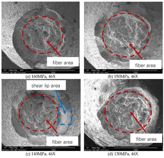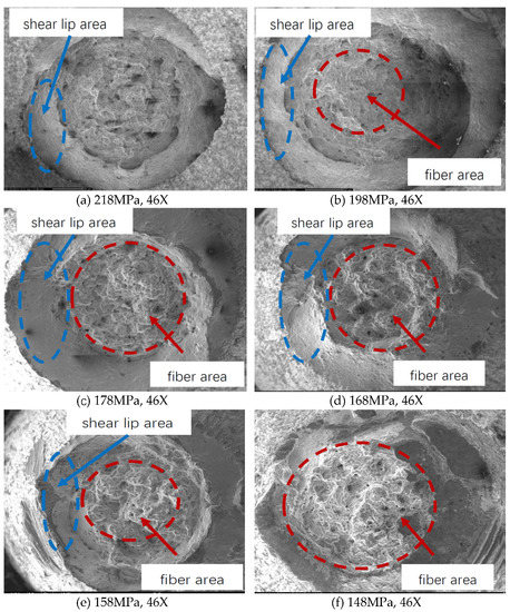 According to GB/T 2039-2012 (uniaxial tensile creep test method for metallic materials) [23], constant load creep tests at five stress levels were carried out at 540 °C and 580 °C. The creep test results showed that the longest fracture time was 6948 h at 540 °C and 148 MPa, and the endurance test lasted 11,012 h at 540 °C and 125 MPa. After the creep test, fracture of the sample was achieved and its micro morphology was observed under a scanning electron microscope, as shown in Figure 8 and Figure 9. We observed that the macro-fracture morphology was cup-shaped, and the micro-fracture morphology covered the fiber area and shear lip area, and no radiation area was observed. Significant plastic deformation occurred throughout the entire creep process.