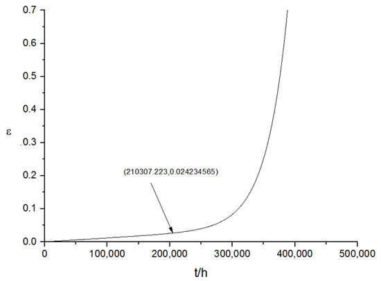 Using Equation (2), the creep fracture curve of P22 pine under the working conditions of 540 °C and 9.58 MPa was drawn, as shown in Figure 11. According to DL/T940-2005 “Technical guidelines for the life assessment of steam pipelines in thermal power plants”, the residual creep life was determined to be 226,205 h, and the specific location is shown in Figure 11. The P22 steel pipe could operate for another 29 years if operated for 7800 h per year.