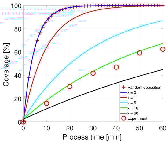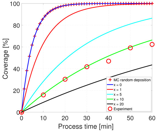 x = 0), which completely matches the coverage results from MC random deposition, as expected. The slope of the coverage curve decreases with increasing preference of deposition on already occupied positions and results converge to the experimental coverage results. The experimental coverage results match with analytical coverage results when the preference is ten (