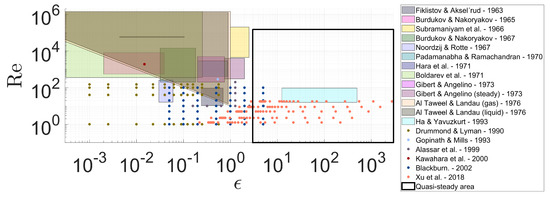 This threshold was suggested as by Gibert and Angelino [35] and supported by Al Taweel and Landau [29], while Drummond and Lyman [39] derived it to be . The general quasi-steady assumption for large is also supported by the theoretical work of Ha and Yavuzkurt [36] and the work of Subramaniyam et al. [29]. Additionally, the experimental work of Xu et al. [41] fit the quasi-steady assumption quite well, for but also . The simulation results of Blackburn [25] and Alassar et al. [40] match each other well and also match the steady-state assumption for . In light of the review of the bulk of recent data, the approach of modeling the HMT for large validly with the quasi-steady assumption is substantiated. Nevertheless, the exact quasi-steady limit remains unclear, but it is approximately . For the sake of a comprehensive approach and in order to avoid model discontinuities (which other authors accepted), is chosen as the quasi-steady limit in this work. Figure 2 shows all the available data, while colored patches indicate a correlation given by the respective authors and dots indicate single data points without a correlation provided. Additionally, a black rectangle marks the quasi-steady area, where a multitude of steady data is available. This quasi-steady area is handled first in the following Section 3.1.