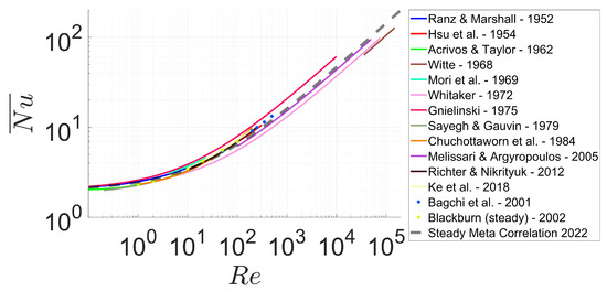 Overview of considered experimental and numerical HMT data for single spherical particles in steady flow. Solid lines indicate correlations provided by the respective authors, while single points indicate individual measurements or simulation points without correlations provided by the authors. Additionally, Steady Meta-Correlation (2) is plotted, which is fitted to the listed data. The Prandtl number is set to as it can be found with air at STP. All the sources of the data are listed in Table 1.