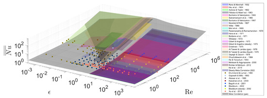 Figure 4 displays all the investigated models in the plane together with Meta-Correlation (4) for gaseous environments. The Prandtl number is set to as can be found with air at STP.