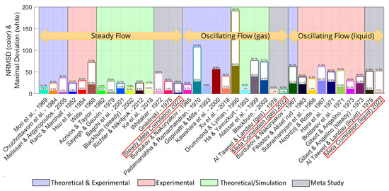 The colored bars give the , calculated with Equation (3), while the white bars give the maximum normalized deviation. Meta-Correlations (4) and (5) deviate insignificantly from Steady Meta-Correlation (2) and from the investigated steady models in general, as pointed out in Section 3.1. While the correlations for steady flow behave very similarly, this is not so clear for oscillating flows. Besides the mentioned necessity for a distinction between gaseous and liquid flows, due to their different asymptotic behavior, the overall measured and simulated data diverge substantially. Drummond and Lyman are the obvious outlier here since they are the only authors who predicted an increase of HMT intensity with a decreasing amplitude parameter , which is also reflected in a large deviation of their data. Blackburn [25] commented on this study and suggested that the mesh resolution near the surface of the sphere might be too low. This would result in the inability to capture the flow behavior for small oscillation amplitudes properly. The other models for oscillating flow, which often cover the same region of the plane, deliver scattered data. This implies an insufficient experimental or simulation design by many authors, or additional dependencies beyond solely the oscillation Reynolds number and the amplitude parameter, contrary to the consensus in the literature. Nevertheless, based on the currently available data, Meta-Correlations (4) and (5) are viable, especially with regard to the large parameter ranges covering several orders. This is also reflected in their from all combined data of 0.8% for gases and 3.7% for liquids. Additionally, Meta-Correlations (4) and (5) only slightly deviate from the previous meta-analyses in their respective part of the plane (1.2% for gases and 8.3% for liquids).