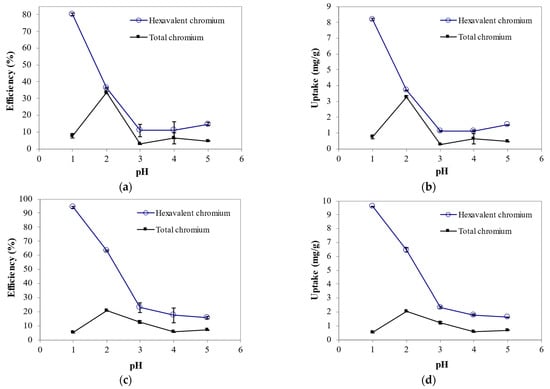 Effect of the initial solution pH on (a) process efficiency and (b) chromium uptake by Bacillus megaterium inactive biomass and on (c) process efficiency and (d) chromium uptake by Rhodotorula sp. inactive biomass (biosorbent dose = 5 g/L, contact time = 48 h, temperature = 25 °C, initial concentration = 51.04 mg/L).