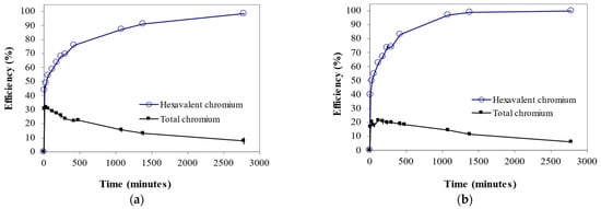 Contact time effect on chromium biosorption efficiency by inactive biomass of (a) B. megaterium and (b) Rhodotorula sp. (pH = 1, biosorbent dose = 8 g/L, temperature = 25 °C, initial concentration = 101.23 mg/L).