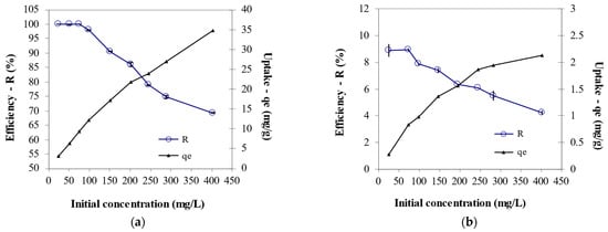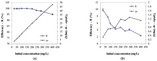 Effect of initial metal concentration on biosorption efficiency and metal uptake capacity of (a) Cr6+ and (b) total chromium by B. megaterium inactive biomass (pH = 1, contact time = 48 ore, biosorbent dosage = 8 g/L, temperature = 25 °C).