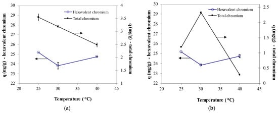 Studies on the influence of temperature have been carried out, considering that temperature is one of the parameters that could significantly influence the biosorption of metal ions by the inactive biomass of microorganisms. It has been shown that adsorption processes tend to be exothermic and their performance varies with temperature [53,54]. Biosorption is not a strongly exothermic process compared to other physical adsorption reactions, but temperature variation can influence the performance of the process [30,54]. According to the review article published by Tang et al. [55] the best biosorption performances of Cr6+ from liquid media by different biosorbents were obtained at temperatures lower than 40 °C. So, the study of the temperature effect on the Cr6+ biosorption by B. megaterium and Rhodotorula sp. was carried out in the temperature range 25–40 °C, and the uptake capacities recorded were graphically represented in Figure 6. Experiments showed that the selected biosorbents have the maximum uptake capacity at 25 °C. At this temperature and an initial Cr6+ concentration of 201.90 mg/L, the B. megaterium inactive biomass removed the Cr6+ from solution with an efficiency of 83.85% and Rhodotorula sp. with an efficiency of 98.72%. With increasing of temperature, the biosorption efficiency decreases to 75.27% and 96.30% at 30 °C, respectively, and then increases with increasing temperature. For total chromium, the best results were achieved at 25 °C by B. megaterium and at 30 °C by Rhodotorula sp.