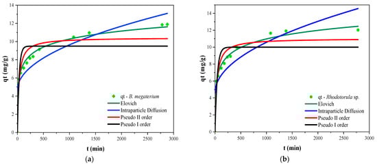 The kinetic characterization of heavy metal biosorption processes is one of the most important issues in designing and/or scaling up of the process [56,57]. These studies give insights into the mechanisms involved in metal ion biosorption, mass transfer or chemical interactions [26,56,58]. Characterization of the metal ion biosorption in kinetic terms is necessary since the hydraulic retention time and reactor dimensions are controlled by the contact time between metal ions and biosorbent required to achieve the desired performance. During biosorption, the largest amount of metal is biosorbed in the first minutes to hours because all active sites on the biosorbent surface are free and available for the metal ions biosorption [27]. In this study, four of the most widely used kinetic models were applied to describe the mechanism of chromium biosorption (pseudo I order, pseudo II order, Elovich model and intraparticle diffusion model). Their graphical representations to the kinetic data are shown in Figure 7, and the values of kinetic parameters and the nonlinear correlation coefficients are included in Table 3. By analyzing both the graphical representations and the values of kinetic parameters, it could be determined that the Elovich model is the most suitable to describe the kinetics of the Cr6+ biosorption by B. megaterium and Rhodotorula sp. inactive biomass. The values of the correlation coefficients are greater than 0.9868 and initial adsorption rate of 4.091 mg/g·min and 2.684 mg/g·min, respectively (Table 3).