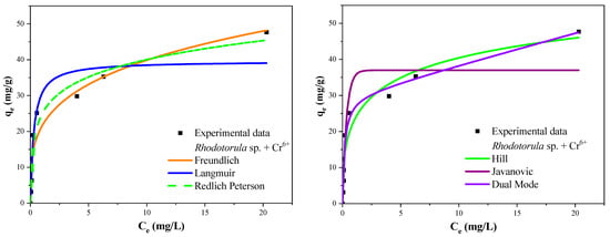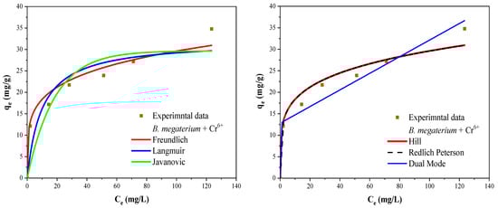 Linear analysis of isotherm data into isotherm models are commonly used, but several researchers have shown that transforming adsorption isotherms into their linearized forms leads to maximization of errors between experimental data and the respective isotherm [59,60,61,62]. So, in this study, the nonlinear forms of Langmuir, Freundlich, Redlich-Peterson, Javanovic, Hill and Dual Mode models were considered for modelling of biosorption isotherms. The isotherm model that best describes the biosorption of chromium ions was established based on correlation coefficients (R2) calculated in Origin Pro 8 software. In Figure 8 and Figure 9, the graphical representation of the nonlinear forms of the Langmuir, Freundlich, Redlich-Peterson, Javanovic, Hill and Dual Mode models applied to the isotherm data of Cr6+ biosorption by B. megaterium and Rhodotorula sp. are shown. The values of the characteristic parameters of each model are included in Table 4. For the Cr6+ biosorption by the inactive biomass of B. megaterium and Rhodotorula sp. was found that that Freundlich isotherm is the model that best fits with the biosorption data, with the correlation coefficient values of 0.9432 and 0.9382, respectively. According to the description of this model, multilayer biosorption occurred and was performed on heterogeneous surfaces with uniformly distributed energy. During the Cr6+ biosorption the stronger binding centers were occupied first, then the others. This model also indicates that the biosorption process of Cr6+ ions is favorable under the given experimental conditions, since the value of the parameter n is between 1 and 10 (n = 4.817 for B. megaterium and n = 3.734 for Rhodotorula sp.).