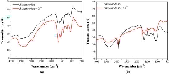 Through FTIR analysis, it was possible to identify the different functional groups in the cell wall structure and to identify the chemical bonds that had a significant contribution to the biosorption of hexavalent chromium. In various studies, it has been highlighted that the aldehydes, alkyl chains, amides, amines, alcohols/phenols, carboxylic compounds, esters, organic halogens, phosphate, sulfoxide and aliphatic organic chains could be responsible for hexavalent chromium biosorption [63,64,65,66,67]. The FTIR spectra of chromium-unloaded and chromium-loaded biomass of B. megaterium and Rhodotorula sp. are shown in Figure 10. The IR spectra of the native biomass and Cr6+ loaded biomass showed that the peak intensities were slightly different, finding that some peaks were slightly shifted and some FTIR peaks appeared after chromium biosorption. The band assignments of the FTIR peaks that changed after chromium biosorption are presented in Table 5. Each absorption band in the IR spectra indicates the presence of a particular functional group on the biosorbent surface. Stretching vibrations of hydroxyl groups, P=O symmetric and asymmetric stretching of phosphate groups, hydroxyl groups from polysaccharides, C–O stretching of alcoholic groups, deformation vibration of C=O carboxylic acids, C–N stretching in amide II group and N–H bending were identified on the surface of the biosorbents, and which changed their absorption bands after Cr6+ contact [66,67]. The FTIR analysis revealed that the changes observed may be due to the interaction between chromium and functional groups (i.e., amino, hydroxyl, and carboxyl groups) found on the biosorbent surface. For example, the wavenumber of the OH stretching vibration on B. megaterium decreased from 3476.05 to 3402.84 cm−1 and on Rhodotorula sp. increased from 3391.28 to 3410.55 cm−1. According to Petrović et al. [68] these changes may be due the possible complexation process.