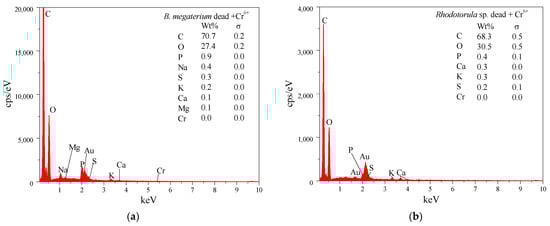 Elemental composition of biosorbents: (a) Bacillus megaterium and (b) Rhodotorula sp. after Cr6+ ions biosorption.