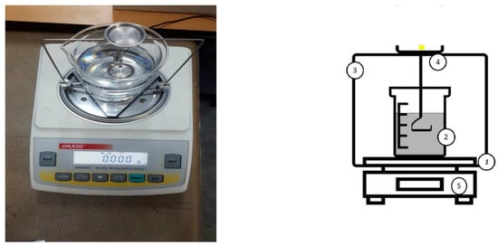 The determination of the apparent density of the studied material is based on Archimedes’ principle. The experimental design is composed of a metal bridge (1), which is mounted on a 75 mm diameter beaker (2), a suspension structure (3) and a basket (4) for the samples. The device is mounted on an electronic scale (5).