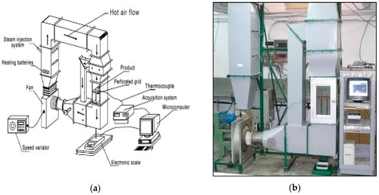 The closed-circuit wind tunnel is used as a drying unit, used for convective drying, in which the hot air is provided by forced convection (Figure 2a,b).