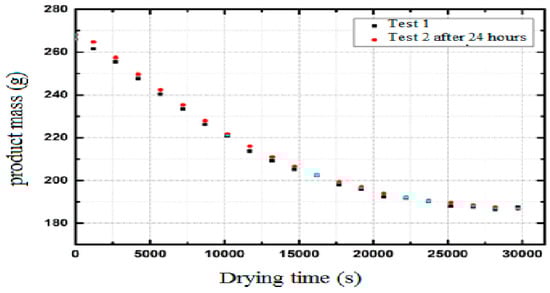 Reproducibility of the curves of the mass of corn during drying, T = 70 °C, V = 1 m·s−1, RH = 5 %, and h = 5 cm.