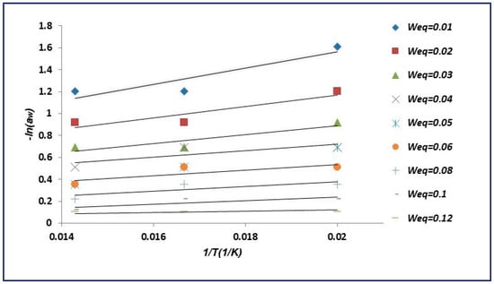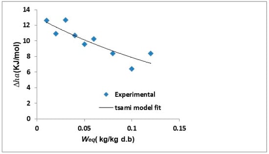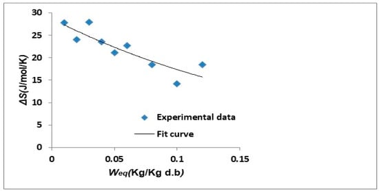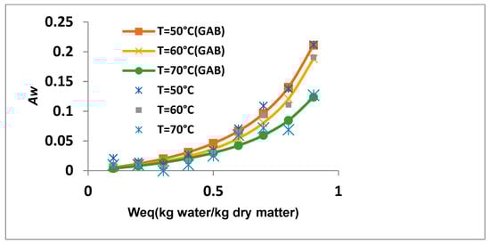 The sorption isotherms are matchless for the individual food materials and are used to avoid food processing problems, like the storage conditions and the energy requirements [28]. To establish a thermodynamic analysis of sorption mechanisms, it is necessary to study the desorption isotherms at different temperatures [29,30,31]. Water sorption isotherm data are required for the estimation of thermodynamic properties, such as desorption heat, differential enthalpy and differential entropy. Several mathematical models are available in the literature to describe the water sorption isotherms of food materials [32,33]. To the best of the authors’ knowledge, there have been no specific results for the whole range of water activities or all types of foods. Labuza et al. [34] have attributed this to the association of water to the food matrix by various mechanisms in different water activity regions.