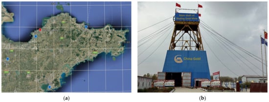 (a) Location map of the main shaft of the Shaling Gold Mine; (b) construction site of the main shaft.