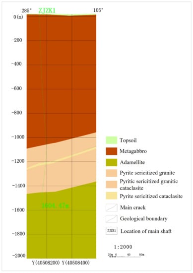 The main shaft of the Shaling Gold Mine is located in Laizhou City, Shandong Province, China. The geomorphic unit belongs to the intersection of hills and alluvial plains, as shown in Figure 1. The designed production capacity of the mine is 12,000 t/d. The main shaft is a circular section with a diameter of 7.8 m, with a ground elevation of +19.0 m, shaft bottom elevation of −1539 m and shaft depth of 1558 m [24]. The area is characterized by a simple formation, well-developed fault structures and the wide distribution of magmatic rocks. The lithology of the hanging wall in the mine is mainly gabbro, while the footwall is pyrite sericite fractured rock, pyrite sericite–granitic fractured rock and pyrite sericite-treated granite, and the remaining rocks are adamellite, as shown in Figure 2.