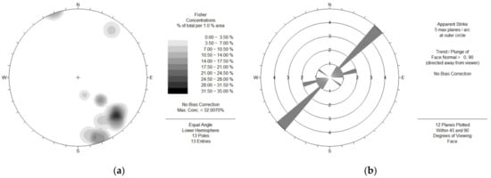 According to the joint survey results of the main shaft at a depth of −1465 m on the site, the joint opening of the surrounding rock is 0.1~0.25 mm, mainly filled with quartz, the main joint group is slightly rough, and the water yield of the joint surface is large. Figure 3 shows the stereographic projection and rose diagram of the main shaft surrounding rock at −1465 m. Figure 3 shows that the dominant joint group of the surrounding rock is one group, with a dip of 310~320°, a dip of 70~80° and an average spacing of 0.43 m. The RQD calculated via the scan line method is 87%.