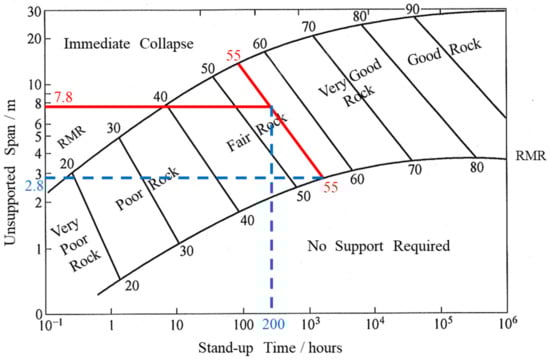 The selection of the shaft support system needs to specify the safe self-stabilization span and the maximum unsupported stand-up time. In rock masses with different excavation spans and different quality grades, the stand-up time of the shaft varies greatly. In a poor rock mass without support, the surrounding rock will instantaneously collapse. The maximum stand-up time and the safe self-stabilization span of the shaft can be estimated based on the RMR, as shown in Figure 5 [28]. It can be seen from the figure that the safe self-stabilizing span of the shaft is 2.8 m and the maximum stand-up time is 200 h, which obviously cannot meet the requirements of a metal mine for the stability of the shaft, so it is necessary to select appropriate support for it.