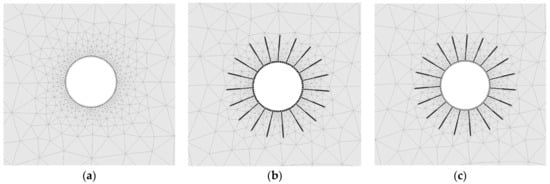 The finite element numerical simulation software Phase2 was used to test the plastic region range and displacement distribution of the surrounding rock with different support systems in the shaft with a depth of 1465 m to verify the application effect of the selected support system. At present, most numerical calculations are carried out under a series of simplified and assumed conditions. Before the finite element numerical simulation of the shaft, it was assumed that the rock mass was a continuous, homogeneous, isotropic medium and conforms to the Hoek–Brown failure criterion. The physical and mechanical parameters of the rock mass were determined according to Table 5. The solution accuracy of the numerical simulation was closely related to the selection of the boundary size. Due to the influence of the boundary effect, the selection of the model boundary was too small, which may have led to a large difference between the final simulation results and the real results. To improve the calculation accuracy, the boundary size was selected as 140 m × 140 m, a six-node triangular division unit was adopted, the grid type was a classified system, the classification factor was 0.05, and the surrounding rock of the shaft wall was densified. A total of 5556 nodes and 2684 triangular elements were divided. The maximum horizontal principal stress of the surrounding rock was 45.8 MPa, the direction was NW65°, the minimum horizontal principal stress was 37.6 MPa, and the vertical principal stress was 40.5. Zero displacement constraints were added in the horizontal and vertical directions to establish the numerical model of the shaft, as shown in Figure 6, and the shaft support model of the lining support, bolt shotcrete support, bolt shotcrete and lining combined support was established, as shown in Figure 7.