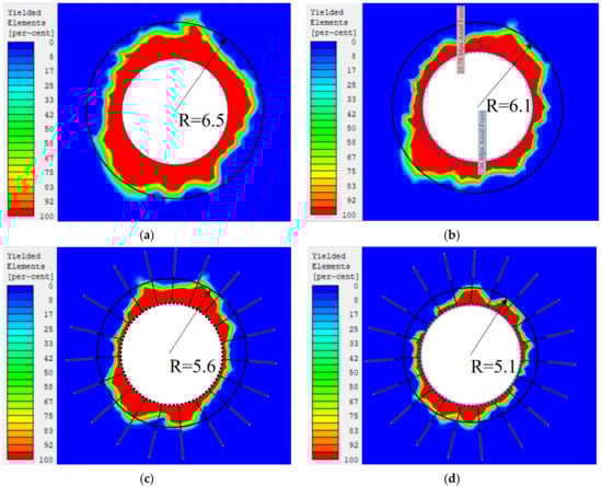 Figure 8 shows the shape of the plastic region in the shaft without support and under different support conditions. Different colors indicate the damage degree of the surrounding rock after excavation. In the unsupported state, the initial plastic region radius of the shaft was 6.5 m, and the plastic region radii under the three supporting conditions were 6.1 m, 5.6 m and 5.1 m. The radius of the plastic region of the shaft was significantly reduced after the adoption of different support systems. Among them, the bolt shotcrete and lining combined support showed the best control effect on the plastic failure of the surrounding rock of the shaft. Compared with the unsupported condition, the plastic region scope was reduced by 22%. The number of yielded elements of the rock mass was reduced from 440 to 142. It can be seen from Figure 8b that the maximum axial force and minimum axial force of the concrete in the existing lining support of the shaft were 23.78 MPa and 1.06 MPa, respectively, meaning that C50 concrete could meet the stability requirements of the shaft.