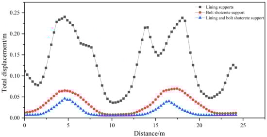 Figure 9 shows the shaft wall displacement curves without support and with different support forms. The distance of the abscissa represents the length from the origin along the anticlockwise direction of the shaft wall with the top point on the left side of the shaft wall as the coordinate origin. Figure 9 shows that the shaft wall displacement was 0.656 m~1.013 m without support, and the maximum displacement was 4.9 m away from the origin. It can be seen from Figure 10 that the displacement of the shaft wall significantly decreased after the support, and the trend of displacement of the shaft wall with different support forms was roughly the same, with peaks appearing at 4~5 m and 16~18 m away from the origin, and the connecting line of the two peak points was basically perpendicular to the direction of the maximum horizontal principal stress. Lining support can only depend on the bearing strength of concrete itself to prevent the deformation and destruction of surrounding rocks. Rigid support easily accumulates deformation energy between the surrounding rocks and the concrete of the shaft and causes high levels of deformation and destruction. Bolt shotcrete support can make the support structure and surrounding rock form an integral part and form a compression arch structure inside the surrounding rock, thus increasing the mechanical properties of weak surrounding rock to resist the damage caused by high stress. Lining and bolt shotcrete support can give full play to the mechanical characteristics of concrete and enhance the bearing strength of the surrounding rock mass itself to achieve the best support effect. The higher the support level is, the smaller the displacement of the shaft wall. After the combined support of bolt shotcrete and lining, the maximum displacement of the shaft wall was only 0.045 mm.
