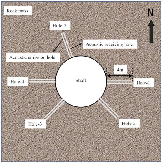 The propagation velocity of ultrasonic waves in geotechnical media is related to the physical and mechanical indexes of the structure. The greater the stress of the surrounding rock, the denser the rock mass and the fewer the cracks, the faster the ultrasonic wave will propagate in the rock mass [38,39,40]. Therefore, the range of the plastic region of the shaft could be determined by using the P-wave velocity test, and the test instrument was RSM-RCT(B). The acoustic emission hole and receiving hole were drilled on the shaft wall at a depth of −1465, and the angle of position was 90°, 135°, 225°, 270° and 340°, as shown in Figure 13. The aperture should have been 0.04 m, the spacing between the transmitter and the receiver should have been 0.3 m, and the drilling depth should have been 4 m. Clear water was required as the coupling medium to accurately measure the P-wave velocity of the surrounding rock mass and to continuously inject water into the hole to ensure that the whole hole could be filled with water, as shown in Figure 14.