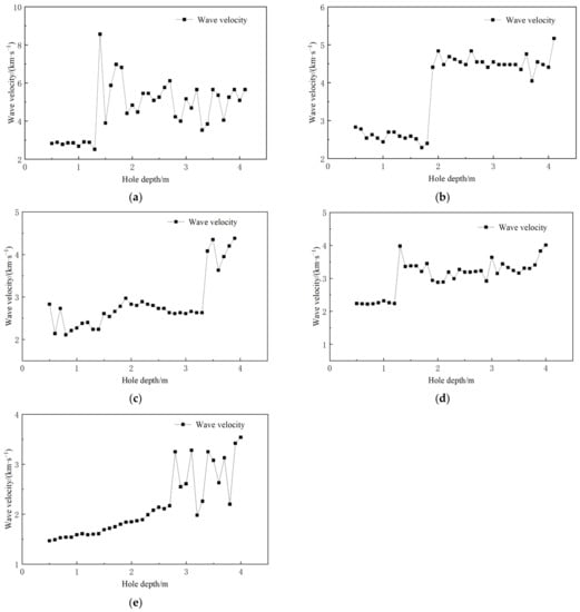 P-wave velocity test curve. (a) Hole 1; (b) Hole 2; (c) Hole 3; (d) Hole 4; (e) Hole 5.