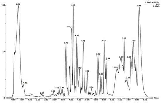 Total ion chromatogram of O. indicum Vent. Wild root bark (OIM) extract subjected to UPLC-Q-TOF-MS analysis (Data from own publication https://doi.org/10.3390/molecules27238459).