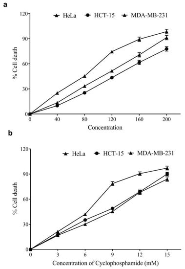 Anti-proliferative activity of OIM extract (a) and standard cyclophosphamide (b) on HeLa, HCT15, and MDA-MB-231 cells.