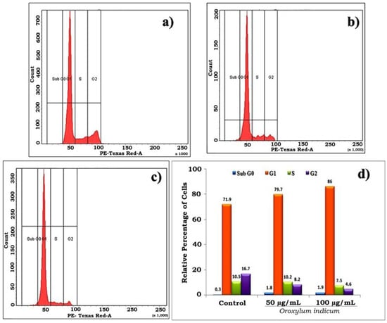 Flow cytometric analysis showing cell cycle stages in (a) untreated HeLa cells, (b,c) HeLa cells treated with OIM 50 and 100 µg/mL, respectively, and (d) a relative percentage of cells at various phases of cell cycle.