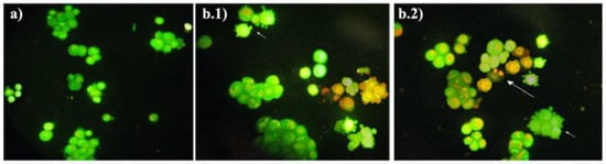 Morphology of HeLa cells with EtBr and acridine orange staining, revealing apoptotic stages. (a) Untreated HeLa cells. (b) Cells treated with 100 µg/mL OIM showed early apoptotic (small arrow—b.1 and b.2) and late apoptotic (long arrow—b.2) stages.