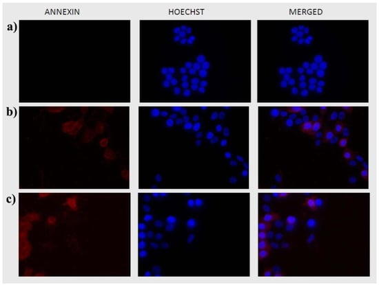 Morphology of HeLa cells with Annexin–Hoechst staining; (a) Untreated cells, (b,c) HeLa cells treated with OIM 50 and 100 µg/mL, respectively.