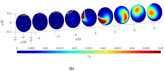 Gas volume fraction distribution on radial pipe cutaway surfaces for the operative conditions considered: (a) QL = 25 m3/h and QG = 3.75 L/min; (b) QL = 30 m3/h and QG = 7.5 L/min. The static mixer is placed at −0.14 < z/D < 0 and the fluids are moving from left to right. The initial and final part of the pipe are omitted to improve readability.