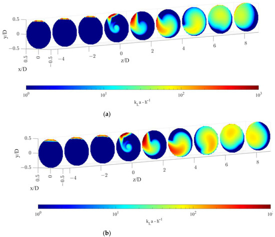 Volumetric mass transfer coefficient on radial pipe cutaway surfaces for the operative conditions considered: (a) QL = 25 m3/h and QG = 3.75 L/min; (b) QL = 30 m3/h and QG = 7.5 L/min. The static mixer is placed at −0.14 < z/D < 0 and fluids move from left to right. The initial and final part of the pipe are omitted to improve readability.